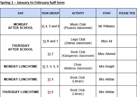 Our clubs change on a half termly basis. Please see below for the current timetable. Contact the front office if you wish to sign up for a club - there are limited spaces for each activity.